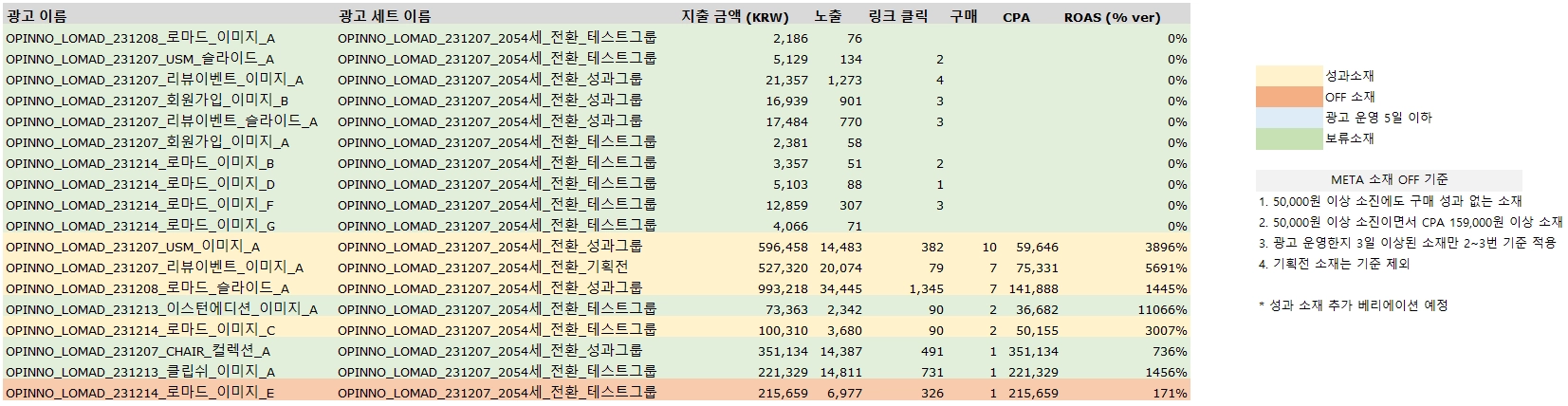 KPI 기준 위클리 소재 성과 디벨롭 및 성과 저조 소재 OFF 진행 (KPI 기준표 활용)