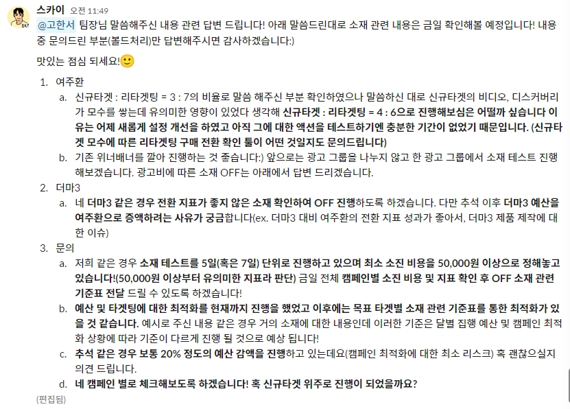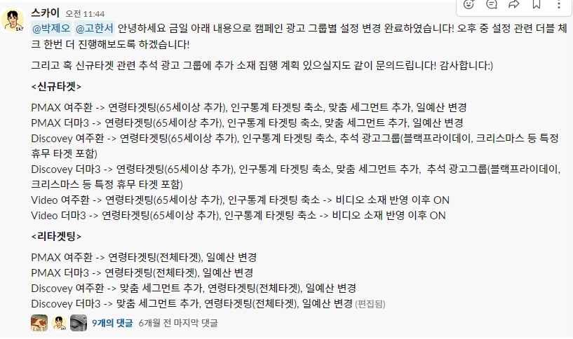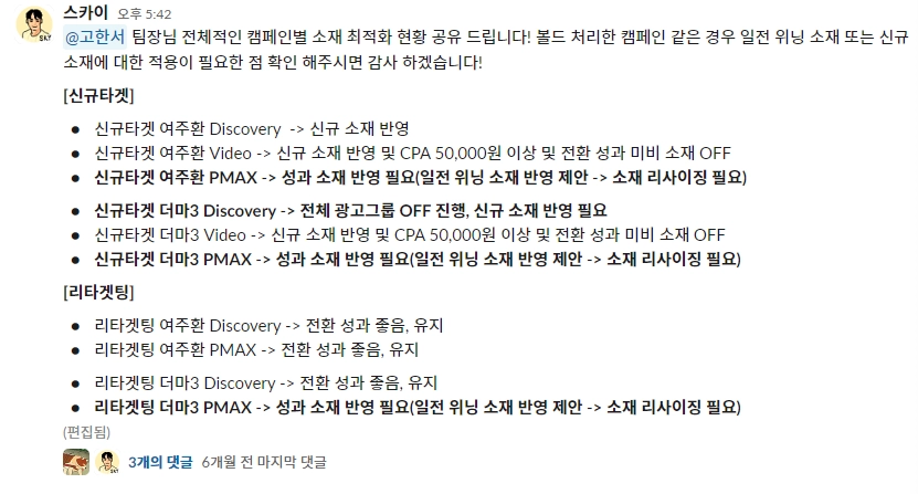 Discovery(신규타겟), Viedeo(신규타겟) 캠페인을 통한 성과 테스트 유지 -> 성과 확인 기간은 5~7일 단위로 진행, 소재는 CTR, CPC, CPM 지표를 통해 결정