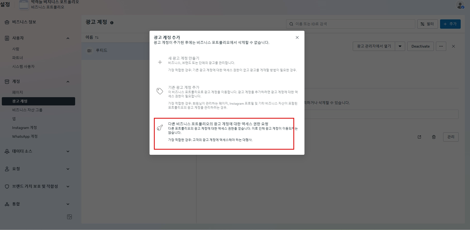 META 광고 계정 ID로 초대 하려면 비지니스 포트폴리오 필요