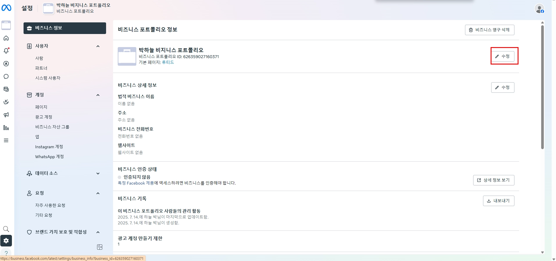 META 비지니스 기본 페이지 설정 및 광고 계정 ID로 초대 받기