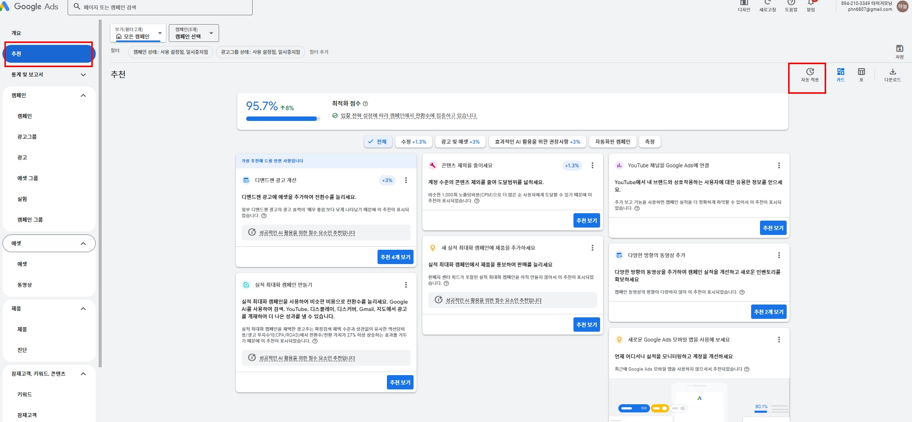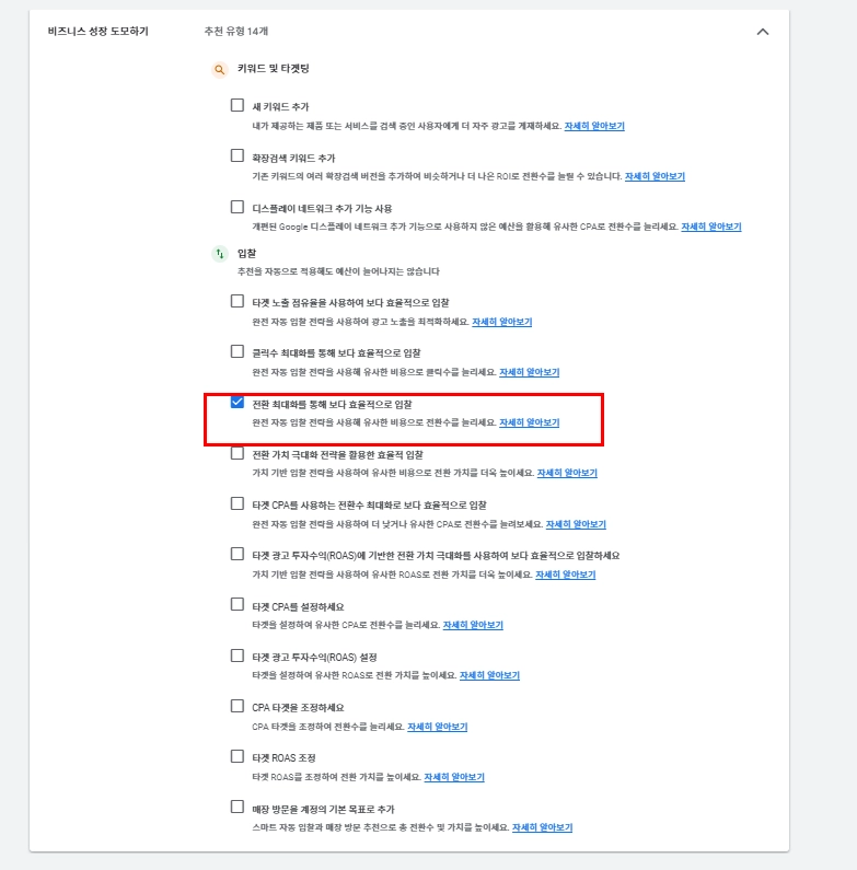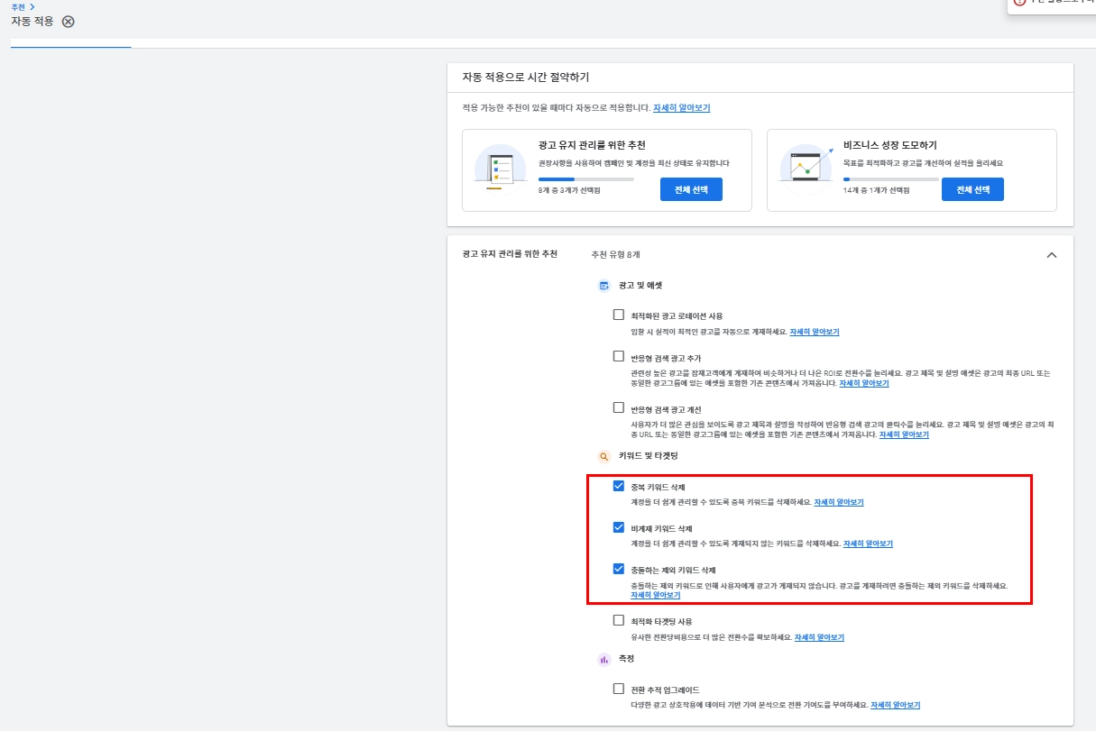 광고 유지 관리 추천 및 비지니스 성장 도모 내 최적화 내용 설정 진행