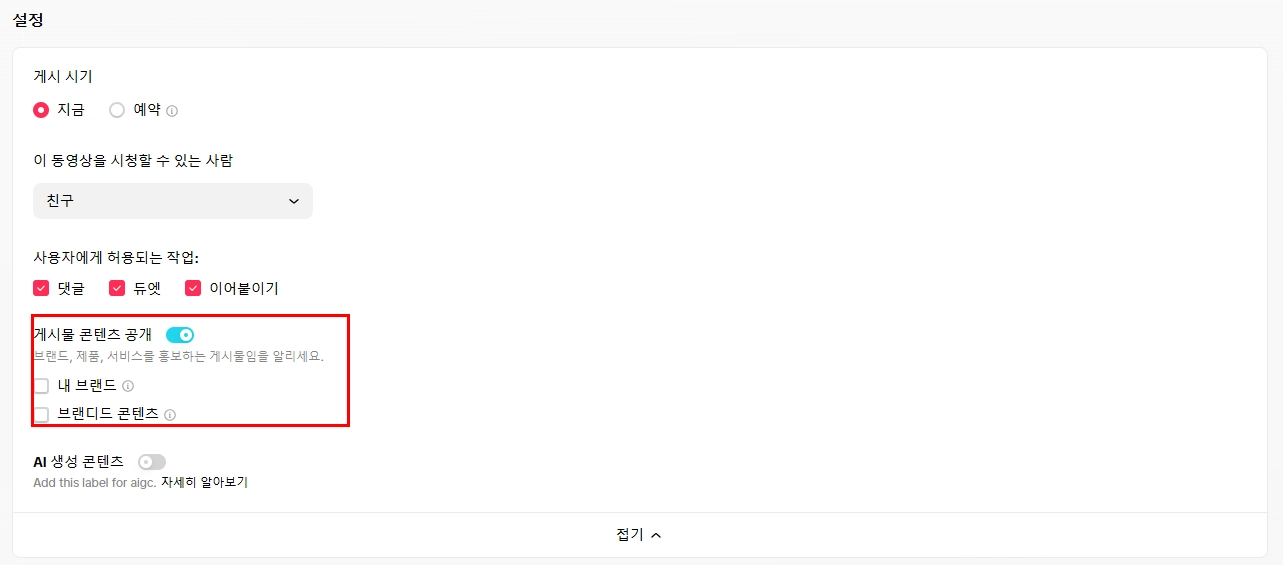 기능 | TikTok에 자체 제작 영상 업로드 시 체크 가능 |